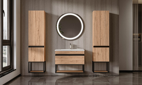 Серія меблів Loft-Iron - це сучасна і стильна колекція для ванної кімнати, яка відрізняється високою якістю матеріалів і вишуканим дизайном. До складу колекції входять різні елементи меблів, такі як раковини, дзеркала, тумби під раковини, високі шафи, полиці та інші деталі. Основним матеріалом, використаним при виготовленні меблів, є МДФ, який відрізняється міцністю та довговічністю.