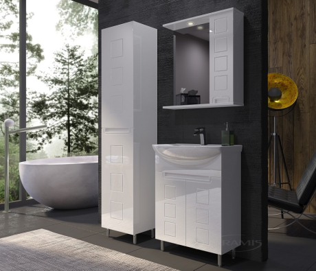 Комплектуються моделі металевими регульованими ніжками з хромованим покриттям. Корпус меблів виготовляється з ламінованого ДСП з підвищеною вологостійкістю. Фасади меблів виконані з ЛМДФ. Фасадна і бічні частини меблів покриваються білою глянсовою емаллю. Білосніжний колір комплекту додасть ванній кімнаті теплого світла.