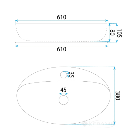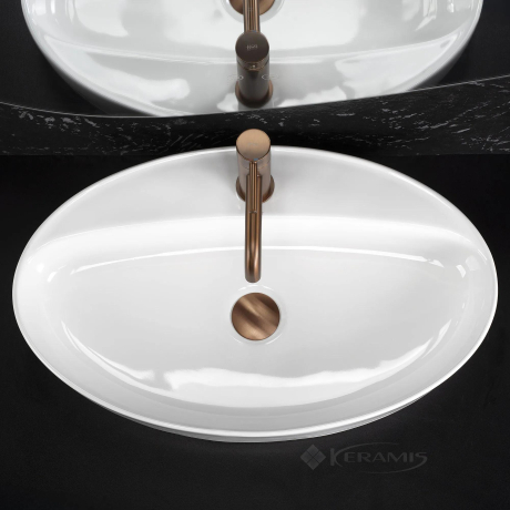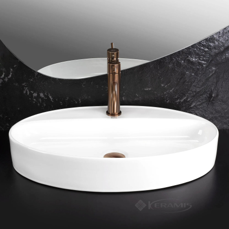 Раковина оснащена поличкою з отвором для змішувача, що робить її ще більш функціональною. Виготовлена з високоякісної санітарної кераміки, вона міцна, стійка до пошкоджень і проста в догляді. Монтаж на стільницю дозволяє максимально використовувати простір ванної, створюючи при цьому елегантну мінімалістичну композицію.
