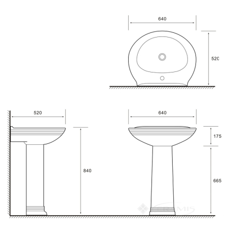 Характеристики умивальника Volle Barco 64x52 з п'єдесталом: